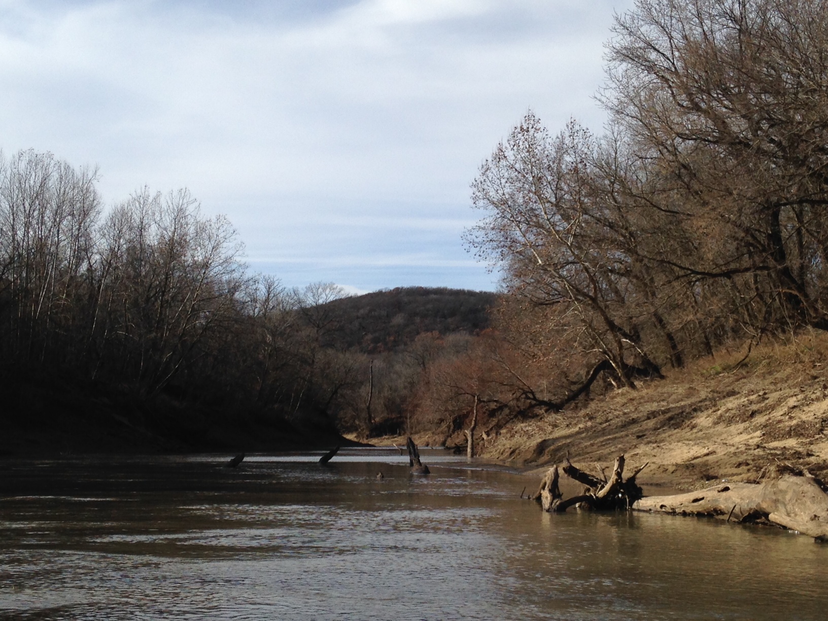 Turning south onto the Caney from the intersection of Sand Creek, the river flows faster and wider. This section of the river is really pretty and we saw a large heron, a couple of turtles, and a coyote running parallel to the bank, until seeing us, and the coyote scurried into the woods.
