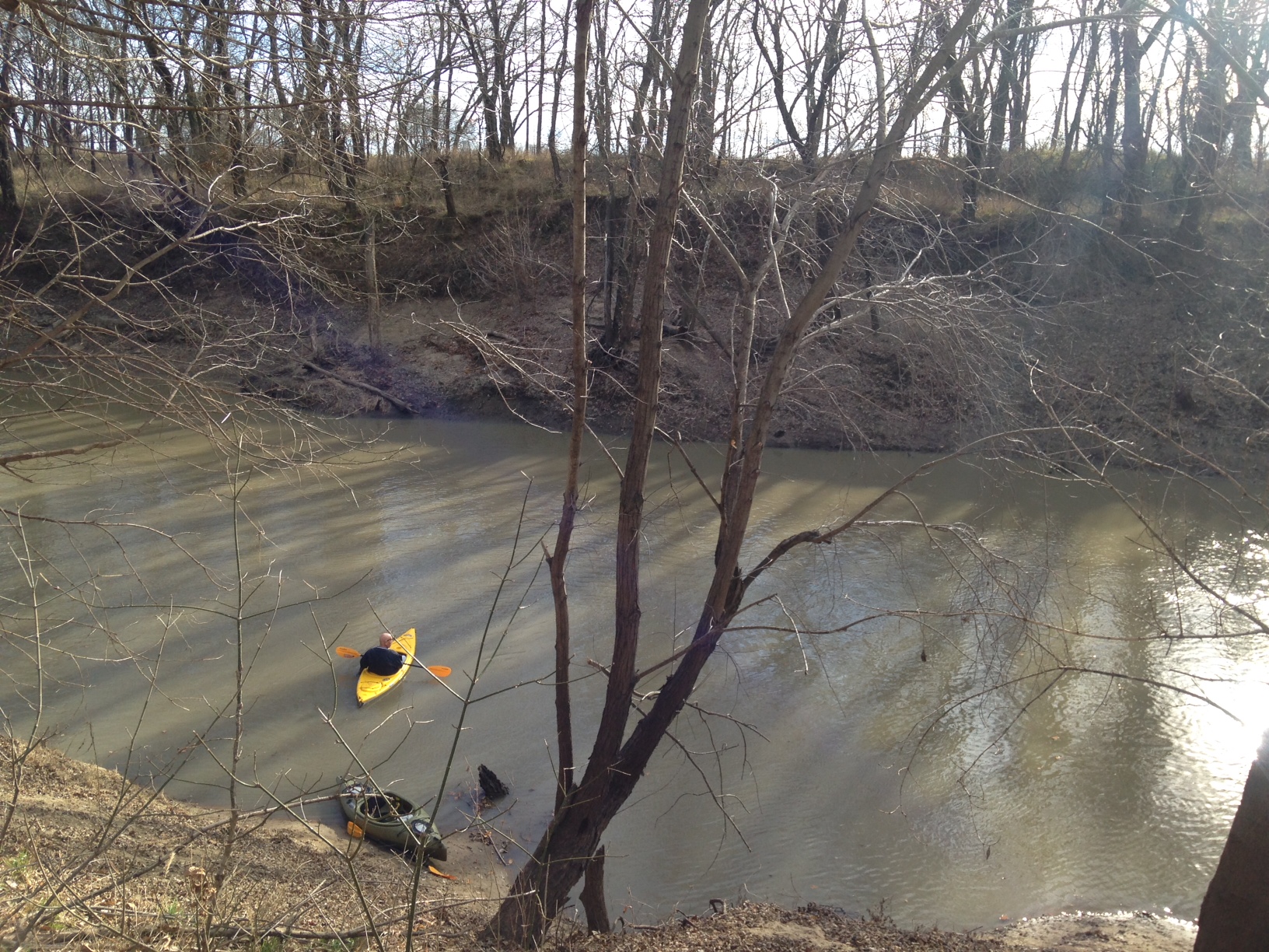 Brandon and I launched our kayaks just below the Cherokee Bridge waterfall unsure of the legality of our venture not to mention the health risk. We set off to kayak the Caney River, because we felt like it, in the mold of Sir Edmund Hillary who once said, “It is not the mountain we conquer but ourselves.”