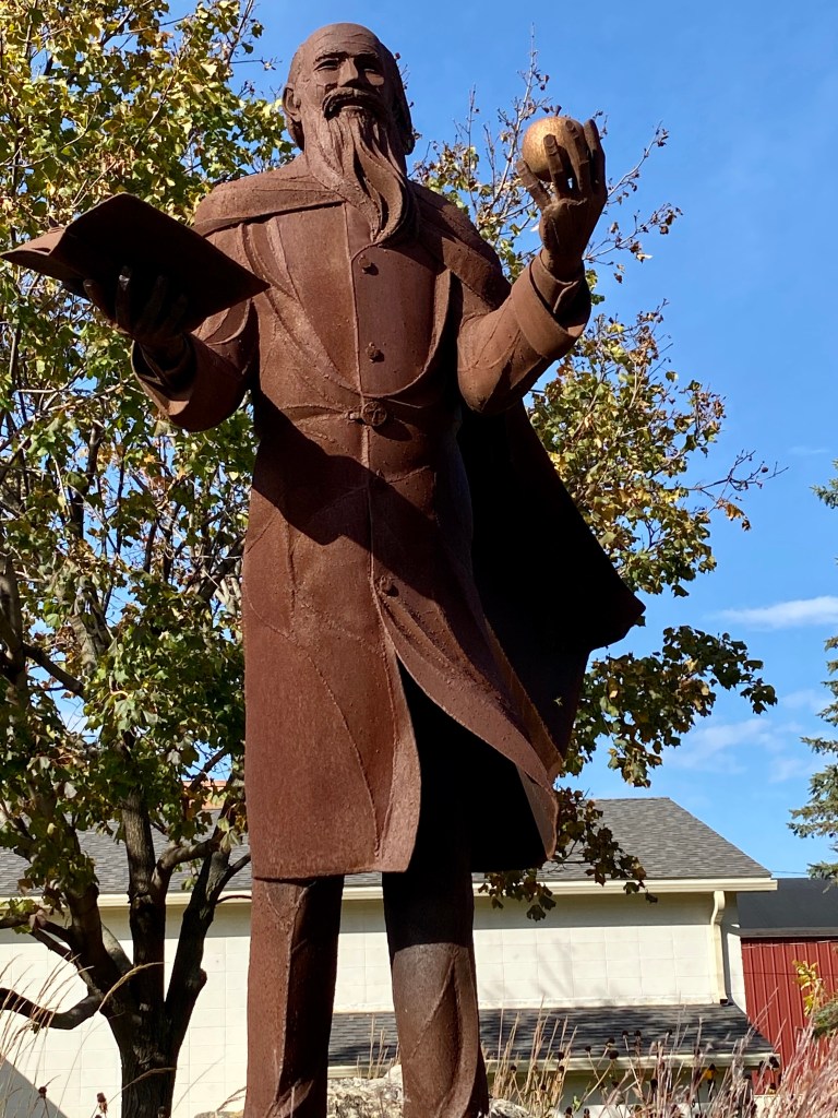 We drove into the small town of Galesville and I yelled stop when I spotted this sculpture on the town square. I thought it was a relative of mine, Johnny (Appleseed) Chapman. But it turned out to be another slightly eccentric but well-intentioned evangelist with an apple. 19th-century Reverend David Van Slyke believed Galesville, WI was the location of the Garden of Eden. This statue makes the reverend seem both noble and insane.