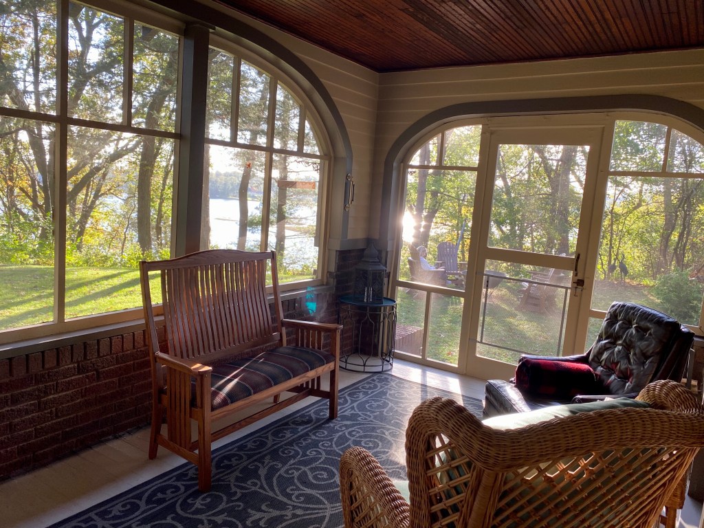 Our 1913 Arts and Crafts home in Galesville, WI was built by the Schenck family. I love the entire home, but especially this screened in porch overlooking an emerald backyard with a firepit and view of Lake Marituk.