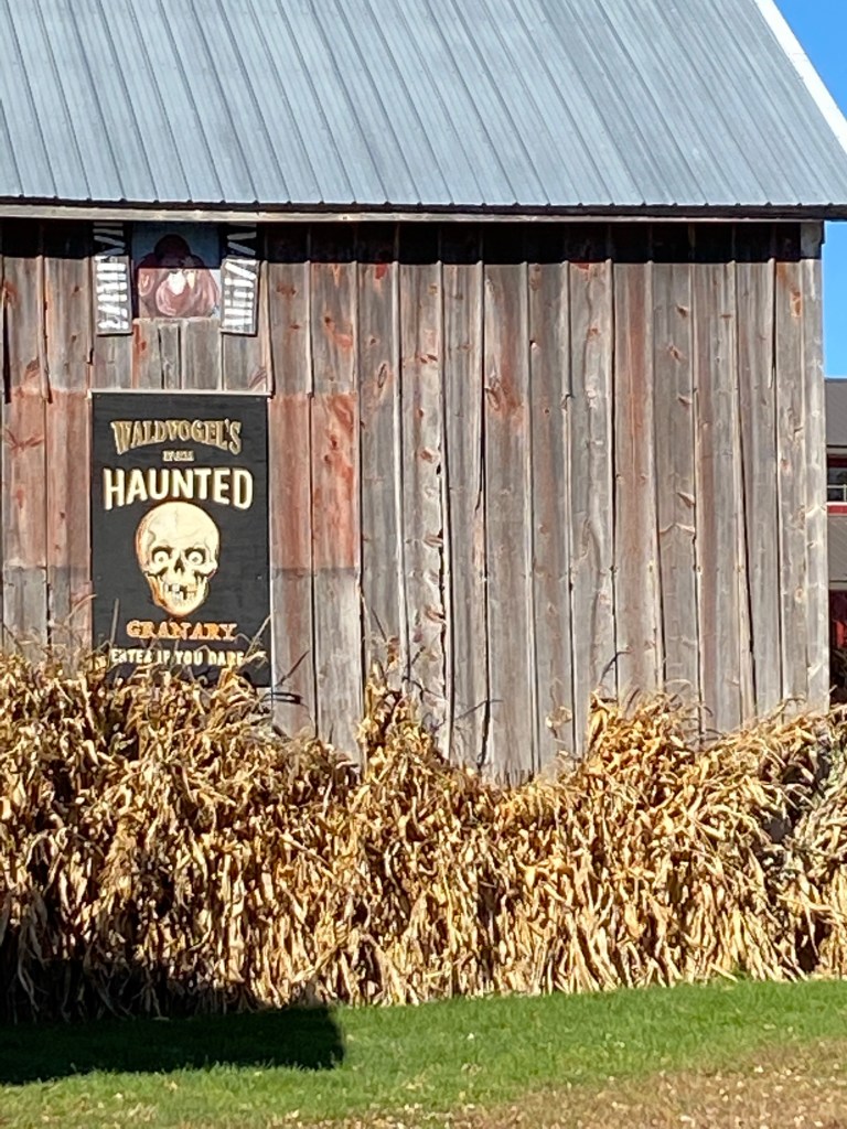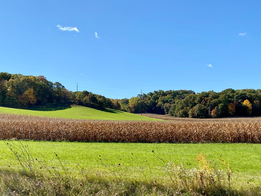 Ribbons of dry tall corn stripe bright green pasture in western Wisconsin