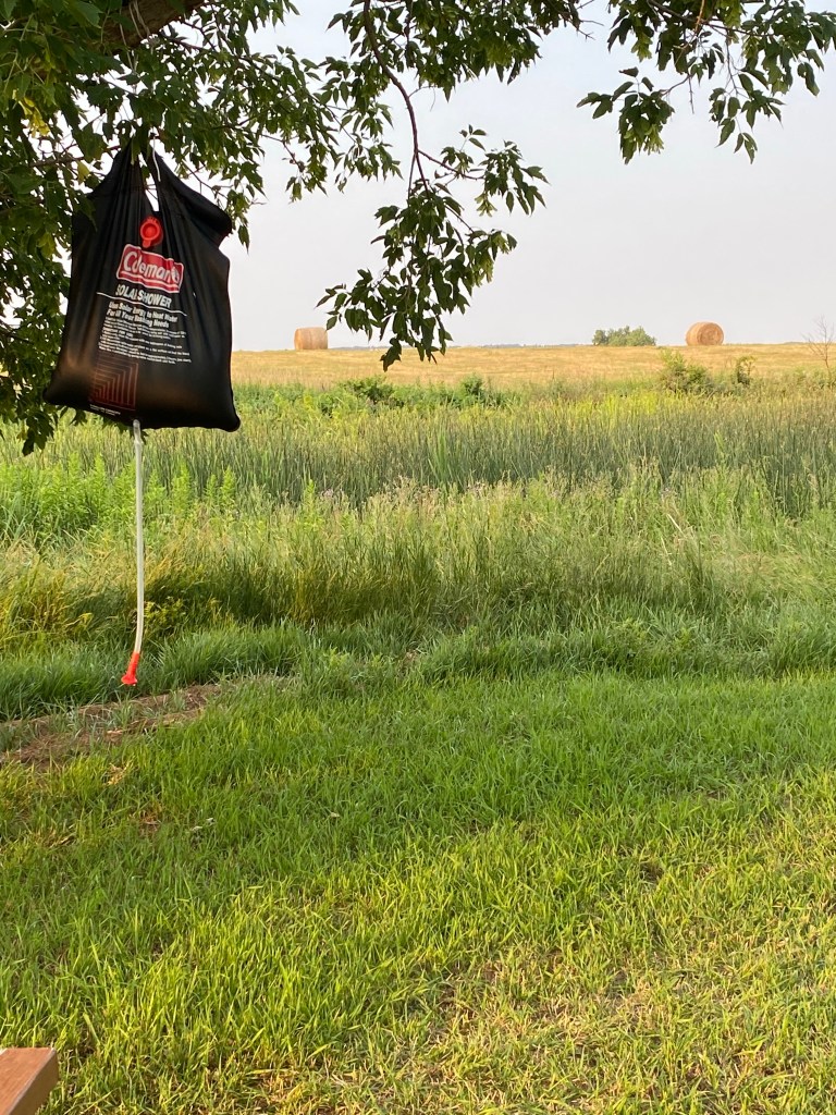 Serendipity arises and asks will you join. I said yes twice and no once. I said yes to a brisk morning prairie shower aided by a solar heated bag of water hanging from a tree limb, my shower screen minimally provided by an upright picnic table.