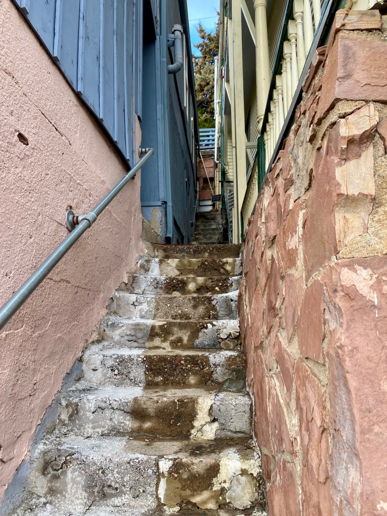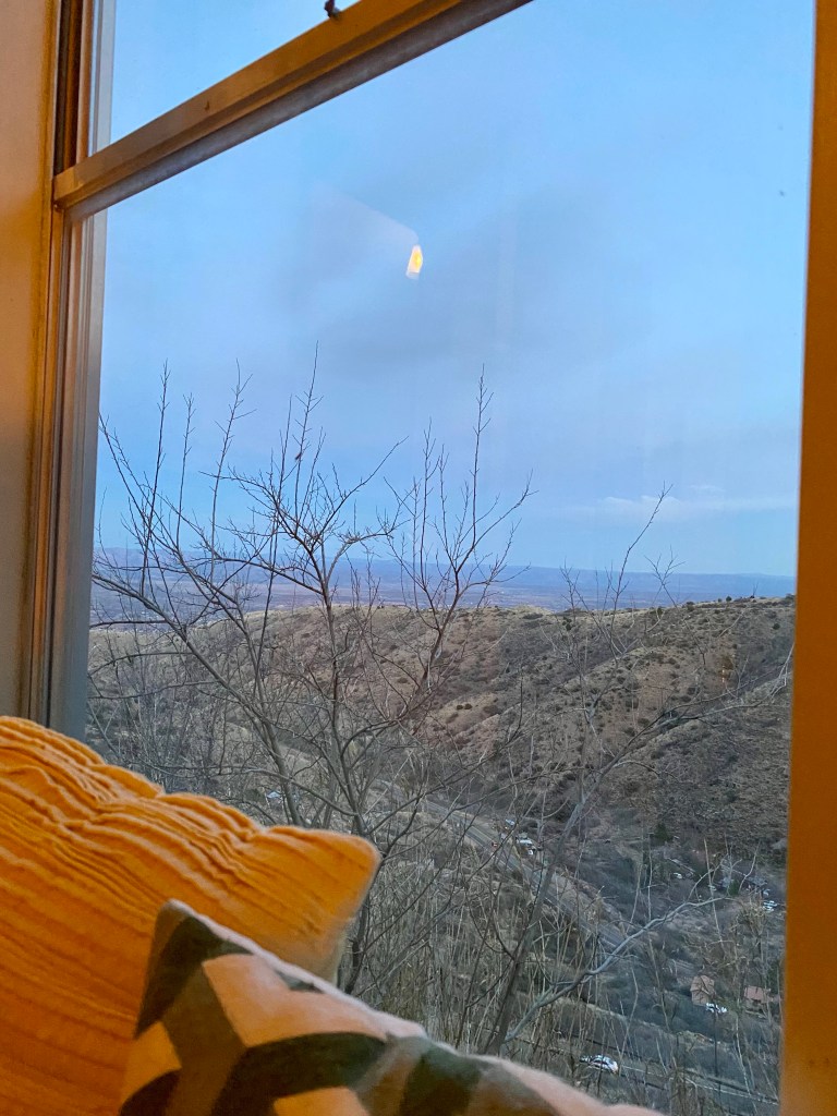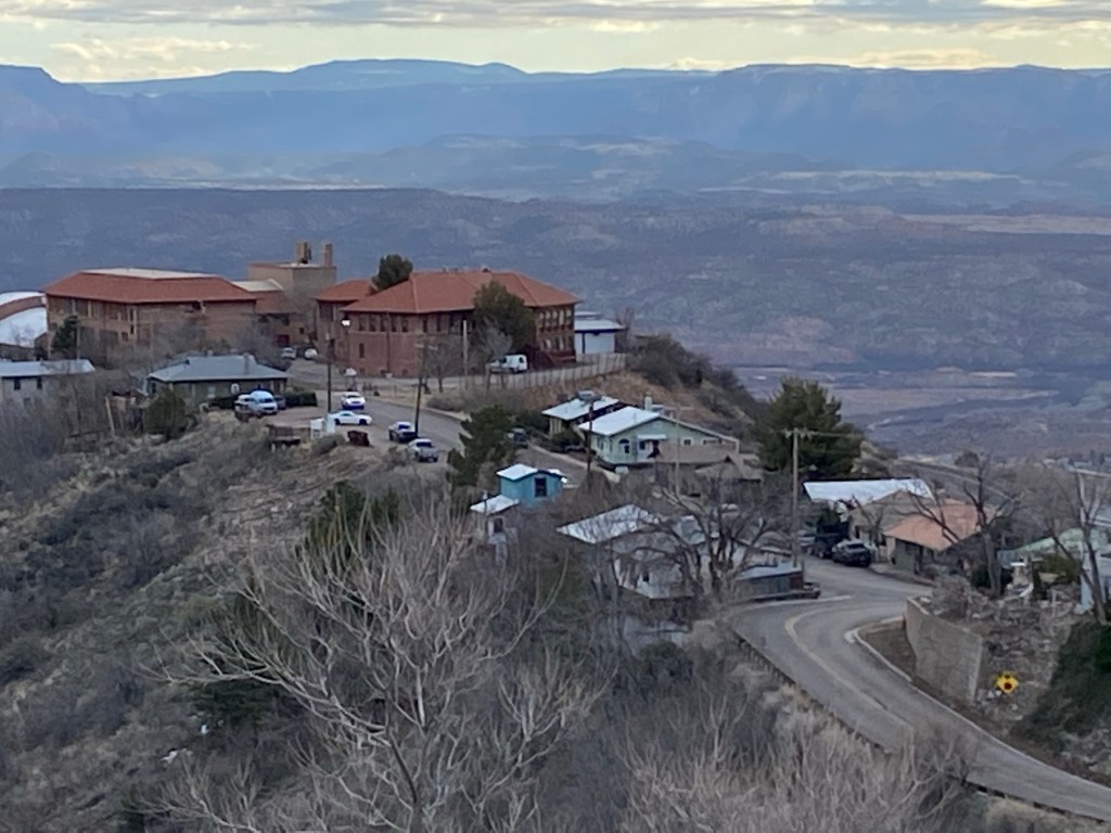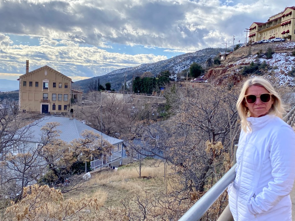 3rd row watched one of the most exciting pickleball matches ever as J W Johnson and Jorja Johnson defeated Anna Lea Waters and Ben JohnsJerome, AZ. Serendipitous Airbnb stay at the mayor’s house which looked out east over the valley. Jerome is an fascinating old mining town re-discovered by hippies and artists and restaurateurs. 15,000 people lived here until 1929 and after the mine closed in 1953 the population dwindled to 100 in the Sixties. Now they claim over a million visitors annually. Remarkable! Dinner at Mariposo Latin restaurant overlooking red rock country Window view from the mayor’s house looking east towards Sedona 25 miles distant Same window morning viewJerome is a once abandoned mining town with rather random city planning Karen enjoys our east view from the living roomAll streets and walks are sloped and buildings carved into the mountain sideA lower tier of Jerome Breakfast at Clinkscale Cafe delicious Karen the history buff wandering Jerome Karen is looking down on a collection of water closets passing tourists try to fill up with coins by tossing them down between the bars Hiked up Secret mountain started in red dirt and transitioned to snow halfway upHiking More hiking