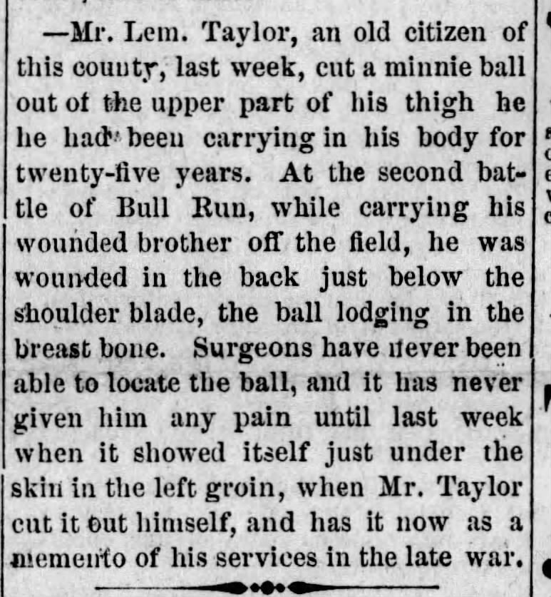 Lemuel Taylor came to Oklahoma from Ohio after the Civil War, carrying a wound he earned at the Battle of Bull Run. He had been helping his brother — whose foot was blown off by a cannonball — when a rifle round caught him just below the shoulder blade. Surgeons never found the lead ball. He healed and went on with his life.